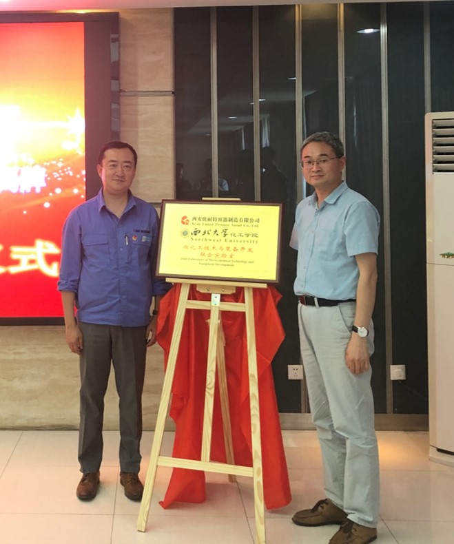350vip浦京集团官方授权执行院长淡勇与西安优耐特容器制造有限公司总经理叶建林签订了《产学研合作框架协议》并为“350vip浦京集团官方授权产学研合作基地”揭牌,随后副院长徐抗震与副总工程师孙万仓为“微化工技术与装备联合实验室”揭牌。